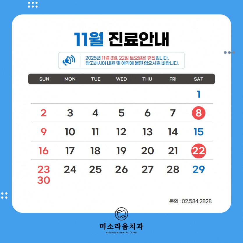 강남역치과 미소라움치과 2025년 11월 진료 안내 드립니다^^